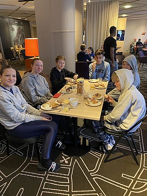 När ledarna gick kontrollrunda runt läggdags luktade det väldigt mycket nagellack i korridoren. När de kom in på tjejernas rum så var det värsta nagelstudion, allas naglar skulle vara fixade i IF Kvilles färger till söndagens tävling. Som vanligt gick det åt mycket pannkakor med nutella och lönnsirap på frukosten. Vi får hoppas att det även slank ner något nyttigt.
